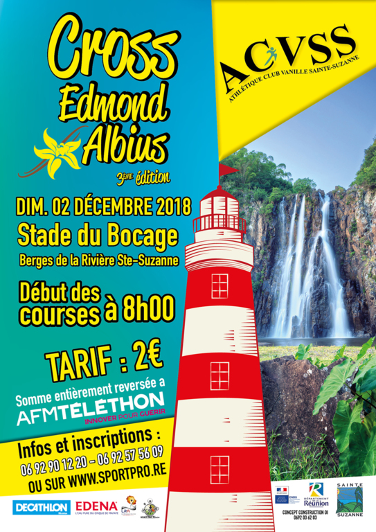 Dans le cadre du téléthon, lAthlétique Club Vanille Sainte-Suzanne (ACVSS) en partenariat avec la municipalité et la ligue réunionnaise d’athlétisme organise LE CROSS EDMOND ALBIUS, le Dimanche 02 décembre 2018 à partir de 08h